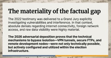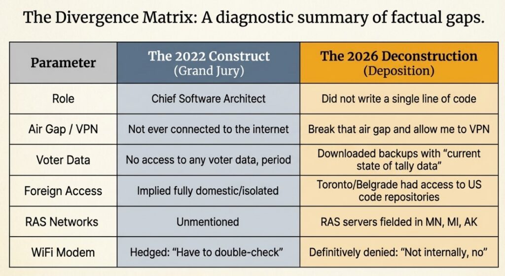 In 2022, Dr. Coomer’s testimony was characterized by categorical denials of remote access and internet connectivity. By 2026, he admitted to the existence of Virtual Private Network (VPN) configurations, Remote Access Servers (RAS), and secure FTP infrastructure used to transmit live tally data. Furthermore, while Dr. Coomer identified as a “Chief Software Architect” in 2022, he explicitly denied writing code or designing systems in 2026. These discrepancies represent a material departure from the narrative provided to the grand jury investigating election interference.