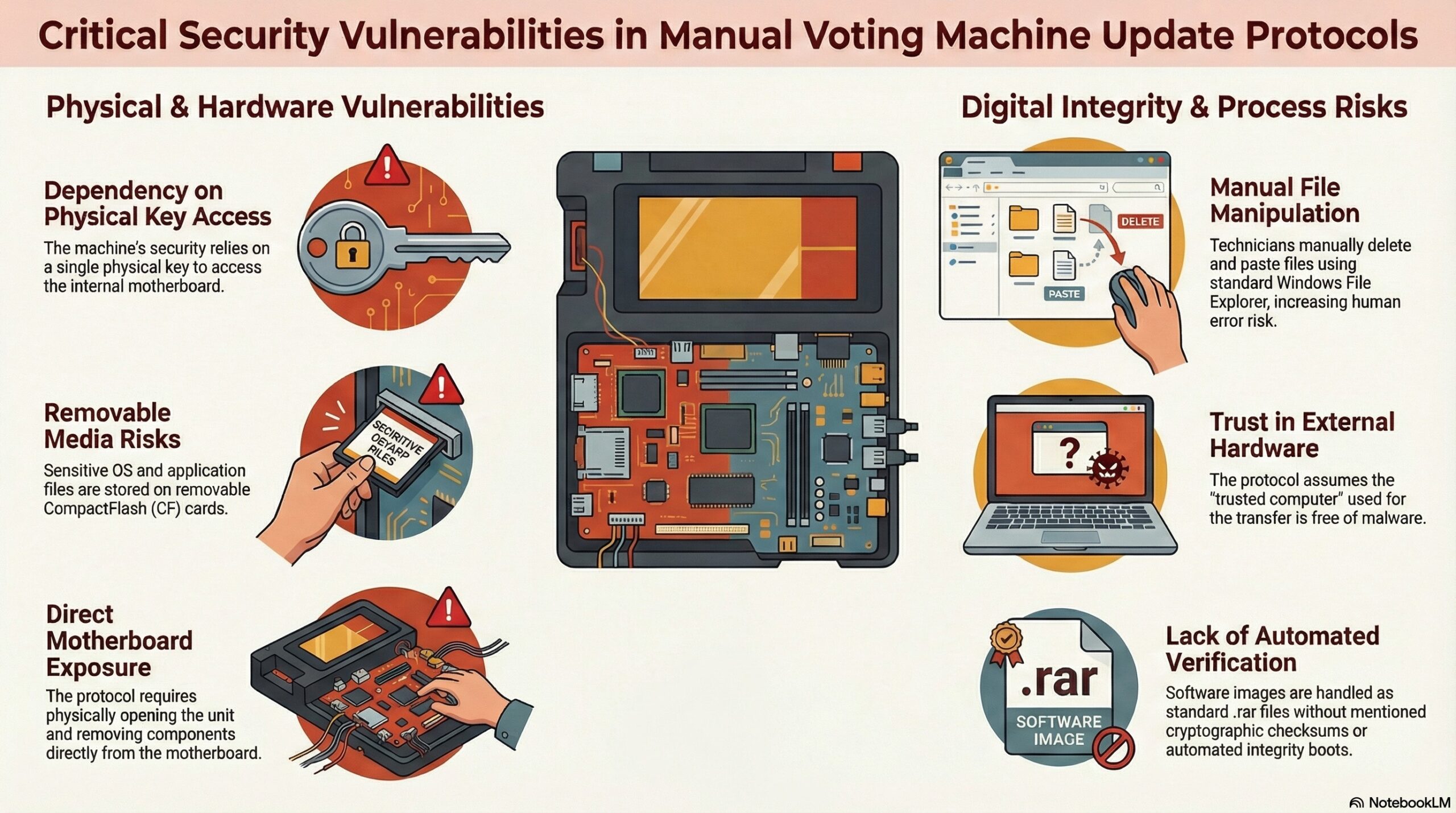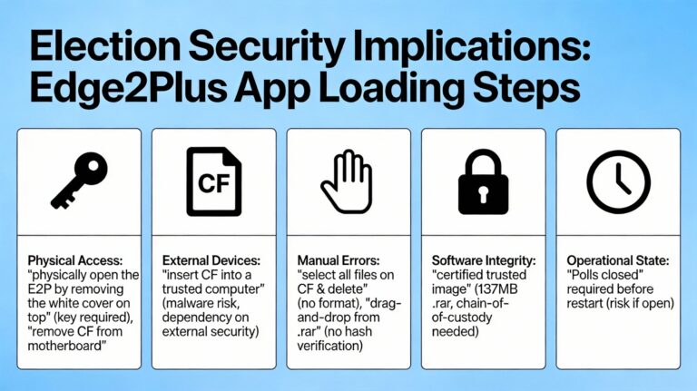 - Dependency on External Security: The integrity of the voting machine software becomes dependent on the security posture of the “trusted computer” used to perform the file transfer.