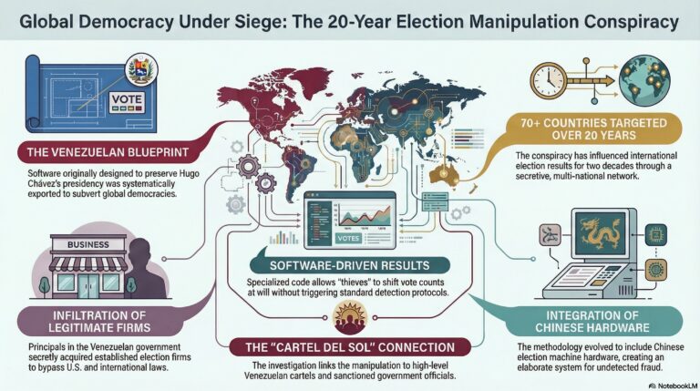 Stolen Elections by Ralph Pezzullo synthesizes investigations conducted by former CIA officer Gary Berntsen and author Ralph Pezzullo regarding the systematic manipulation of democratic elections. The core findings suggest a 20-year foreign conspiracy, initiated by the Venezuelan government under Hugo Chávez, to subvert election results globally. Through the development of specialized software and the strategic acquisition of election firms, these actors have reportedly altered outcomes in the United States and over 70 other nations. The investigation highlights a sophisticated methodology involving Venezuelan-developed software, Chinese hardware, and the exploitation of administrative vulnerabilities. Key concerns include the integrity of the 2020 U.S. election, potential fraud in 2024, and the influence of international cartels on democratic institutions.