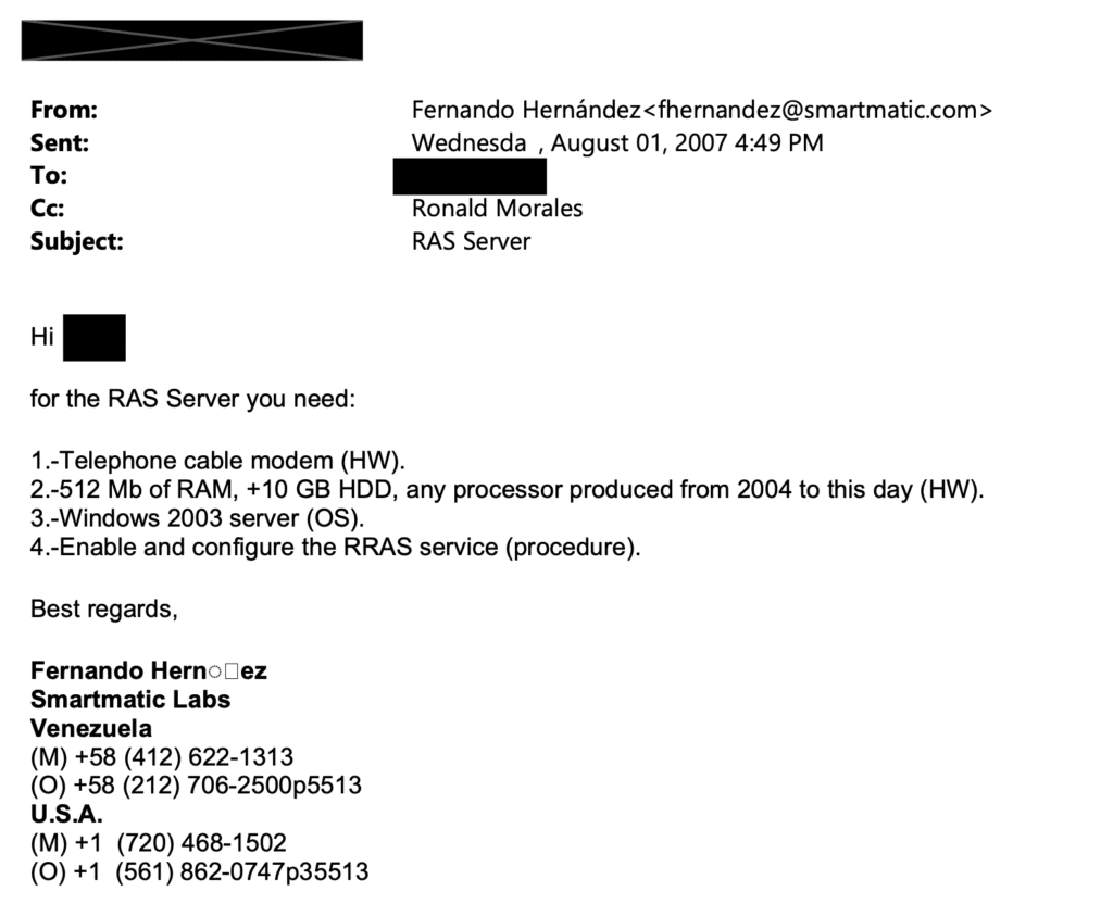 On August 1, 2007, Fernando Hernández of Smartmatic Labs in Venezuela sent an email to Ronald Morales of Sequoia Voting Systems with the subject line “RAS Server.” The email laid out a concise list of components needed for the server.