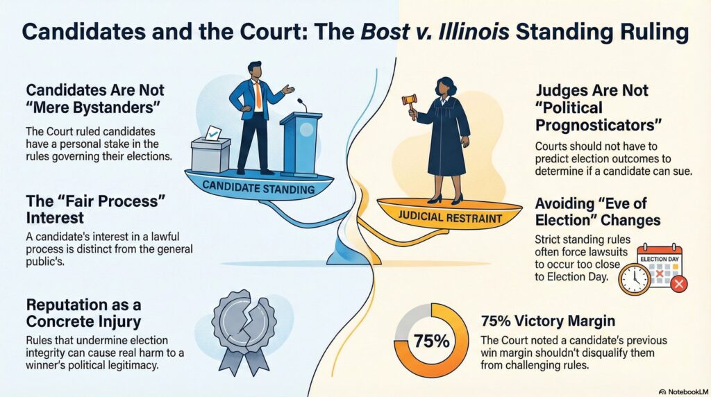 Chief Justice Roberts, writing for the Court, said unlawful election rules can injure candidates by forcing them to spend extra resources, affecting vote share, damaging reputation, and—apart from all that—by denying them a fair and lawful process.